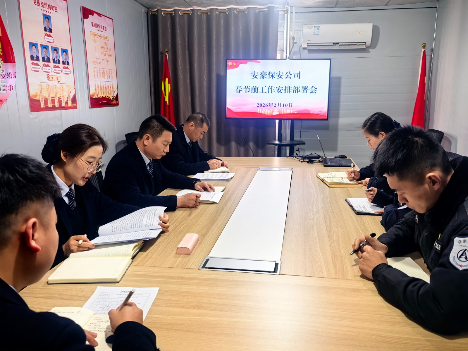 2月10日,安豪保安公司在万达基地一楼会议室召开春节前重点工作部署会。会议传达学习了集团公司2025年工作总结暨表彰大会会议精神,通报了公司春节前安全隐患、矛盾纠纷排查等情况,对节日期间的值班值守、安全生产及后勤保障等工作进行了安排部署。会议由集团副总经理兼保安公司总经理上官敬升主持。保安公司各大队负责人参加会议。