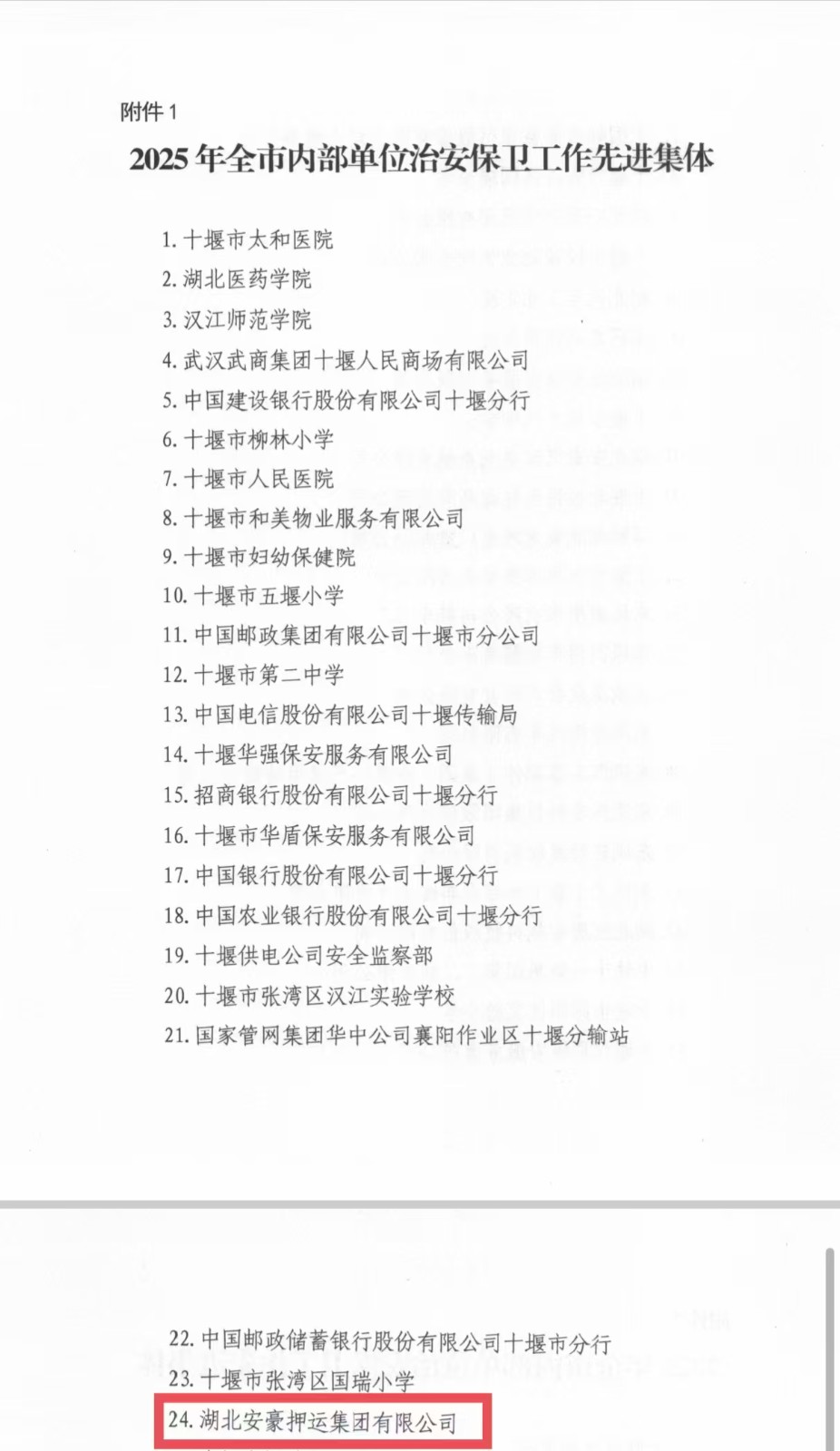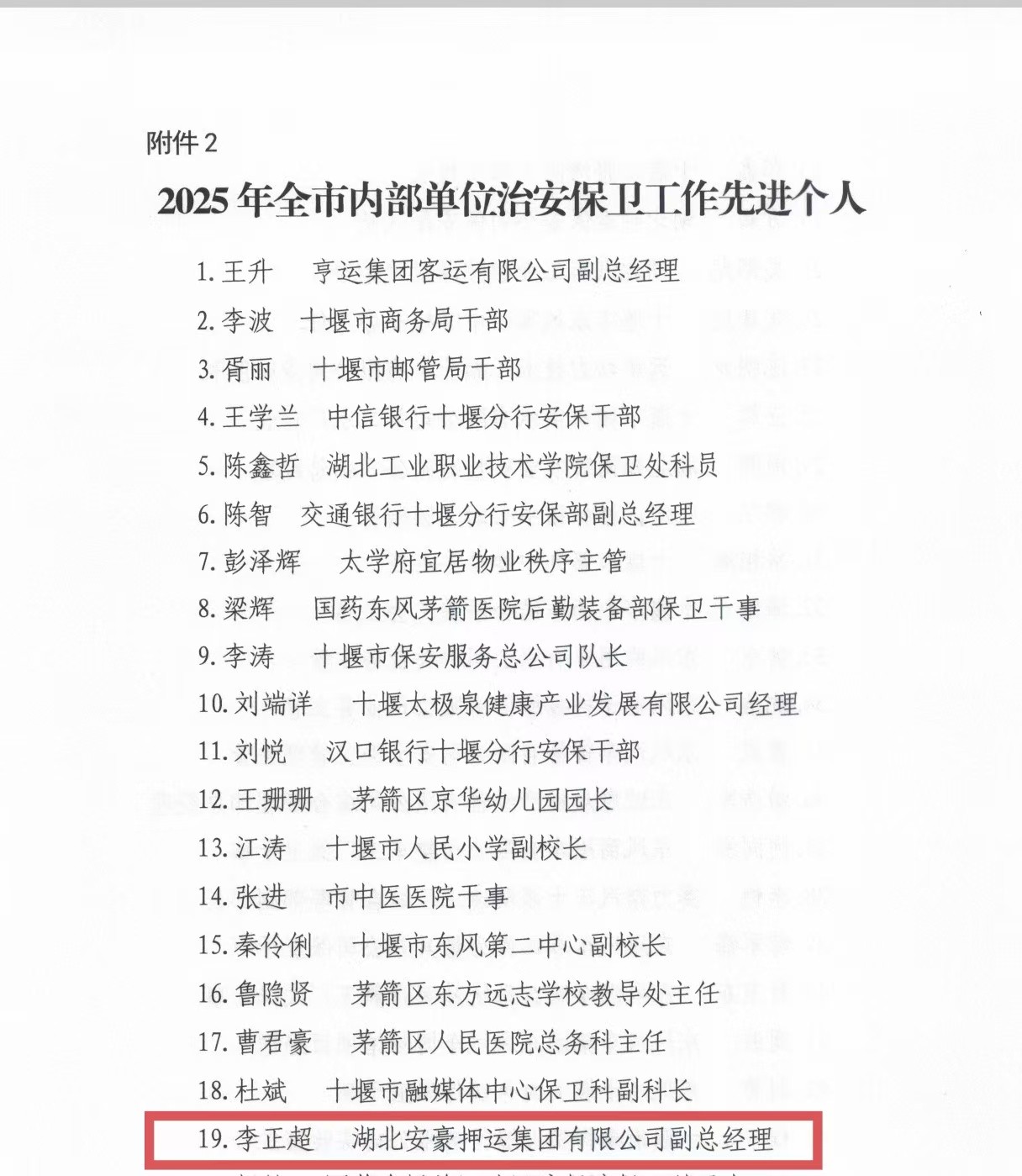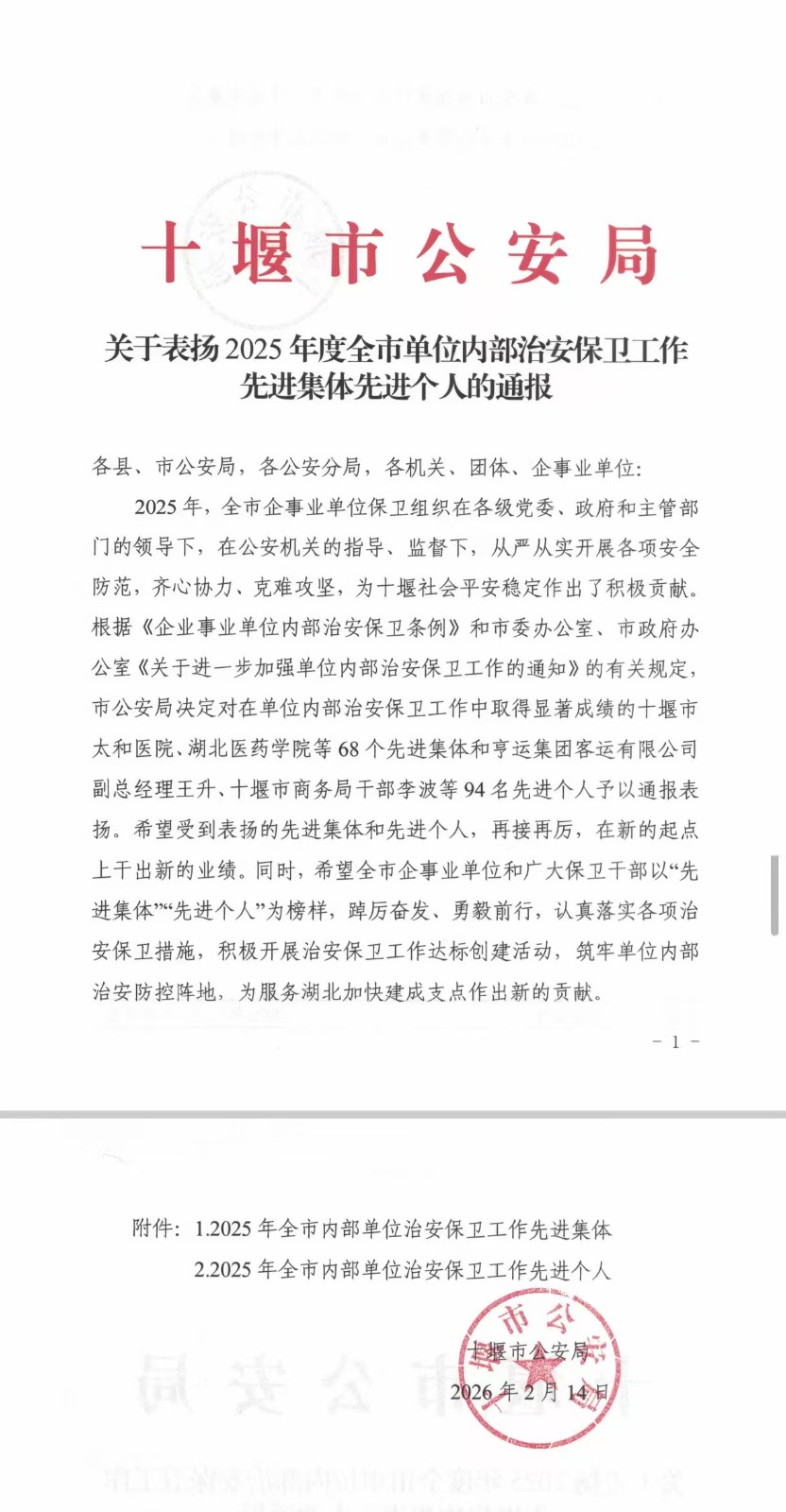 2月14日,十堰市公安局印发文件,对2025年为十堰社会平安稳定作出积极贡献的集体和个人进行通报表扬。湖北安豪押运集团有限公司获“2025年全市内部单位治安保卫工作先进集体”,集团党委委员、副总经理李正超获“2025年全市内部单位治安保卫工作先进个人”。这也是自2023年以来,集团公司连续三年荣获此项工作“先进集体”表扬。